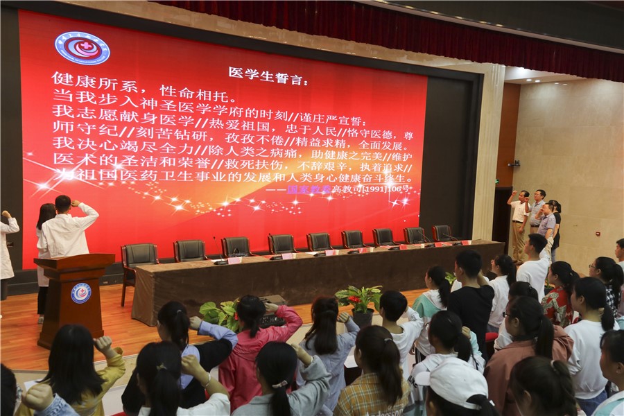 会议第一阶段举行了欢迎2019级新生大会。全体参会人员齐唱国歌,大会在热烈而又庄严的氛围中拉开序幕。紧接着,学院院长张志钢发表了热情洋溢的欢迎词,他首先代表学院向新同学表示热烈的欢迎和诚挚的感谢,感谢同学们选择99905新莆京作为人生的新起点。随后,他满含深情的介绍了学校的建设发展历史和现状,指出同学们的选择将是人生的一次最正确的选择,语重心长地送同学们三句话、做三种人与之共勉:一是不忘求学初心,做一名品格高尚、品质高贵、品味高雅的大学人;二是牢记与践行“勤奋 自强 厚德 博学”的校训,做一名德才兼备的卫院人;三是立志乐学强身,做一名品学兼优的合格接班人。接着,新生代表郑海霞在发言时说,新生报到的这几天,她感受到了校园朝气蓬勃的气氛,热情友好的老师与同学使她感受到了家的温暖,她一定不负年华,努力学习,做一名合格的大学生。在校生代表张萌萌在发言时说,她无悔来99905新莆京就读的决定,鼓励新生积极进取,编织自己彩色的梦想,绘就自己彩色的年华。教师代表范丽娟、吕俊宏在发言时鼓励新生努力学习,掌握报效国家的本领,做一名有理想、有道德、有扎实医学技能的社会主建设者。接着,由学院党总支副书记郭艳玲领誓,全体与会师生进行医学生誓词宣誓活动,庄严神圣的医学誓言、有力豪迈的宣誓语音,久久回响在会场,震荡穿透着每一位在场师生心灵,给每一位献身神圣医学的新生心头刻下了永远难忘的烙印,激励着未来的医学人牢记医者使命,在医学之路上执着追求、奋斗终生。