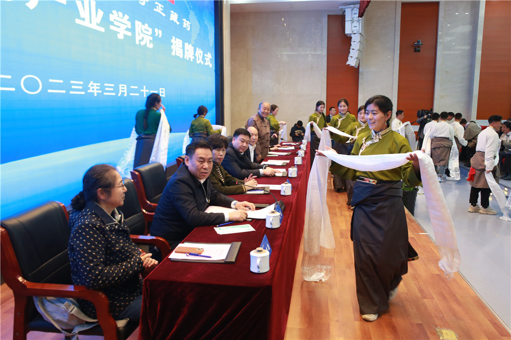 甘肃省教育厅职业教育与成人教育处处长令军辉,兰州新区职教园区服务保障中心党委书记、主任李常锋,西岔园区党委副书记、管委会主任曾俊萍,奇正藏药集团董事长雷菊芳,奇正藏药集团副总裁何维颖,校党委书记包磊,校长任晖,藏医药产业学院分管副校长张军荣,学校在家领导班子成员出席揭牌仪式。来自四川、西藏、青海等地的藏医药专家、藏医班教师、学校相关部门负责人、教师代表、学生代表、首届藏医班全体学生和各界媒体朋友共300多人与会。揭牌仪式由学校党委书记包磊主持。