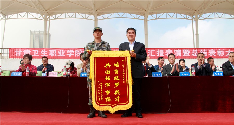 军训汇演结束后,学院党委书记姜德民同志代表学院向承训部队赠送锦旗,刘相芳副营长、任世伟副校长分别发表讲话。刘相芳副营长代表承训部队教官充分肯定并感谢学院各部门细致入微的军训服务保障工作,盛赞2018级新同学们在军训期间所展现出的团结协作意识与“流汗不流泪,掉肉不掉队”的军人品质。随后,任世伟副校长发表讲话。他首先代表学院领导班子,向为此次军训工作做出突出贡献的西部战区陆军保障部汽车营全体教官表示崇高的敬意和衷心的感谢,向圆满完成本次军训任务的全体同学们和为本次军训做出辛勤工作的教职员工表示诚挚的慰问。同时,向2018级的新同学们提出两点希望:一是要听从中国共产党的领导,坚定中国特色社会主义的崇高理想和伟大信念,坚持学习知识技能和思想道德修养的统一,坚持实现自身价值与报效祖国的统一,坚持青春梦成才梦与中国梦的统一。二是希望大家继续保持和发扬在军训中形成的好作风、好习惯、好品质,珍惜美好年华,矢志艰苦奋斗,积极践行“厚德、博学、勤奋、自强”的校训精神,互相帮助、团结友爱,做文明学生,创文明班级,建设和谐校园。
