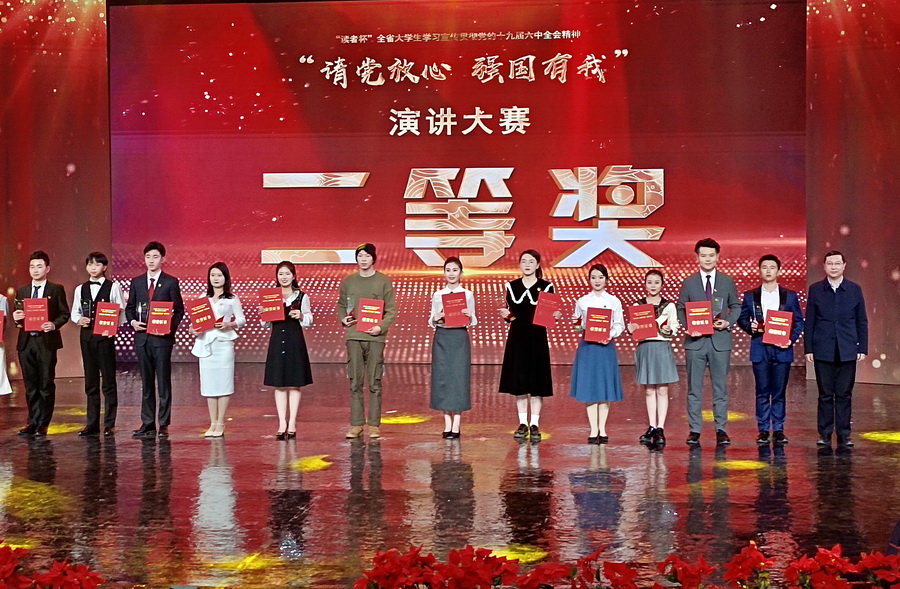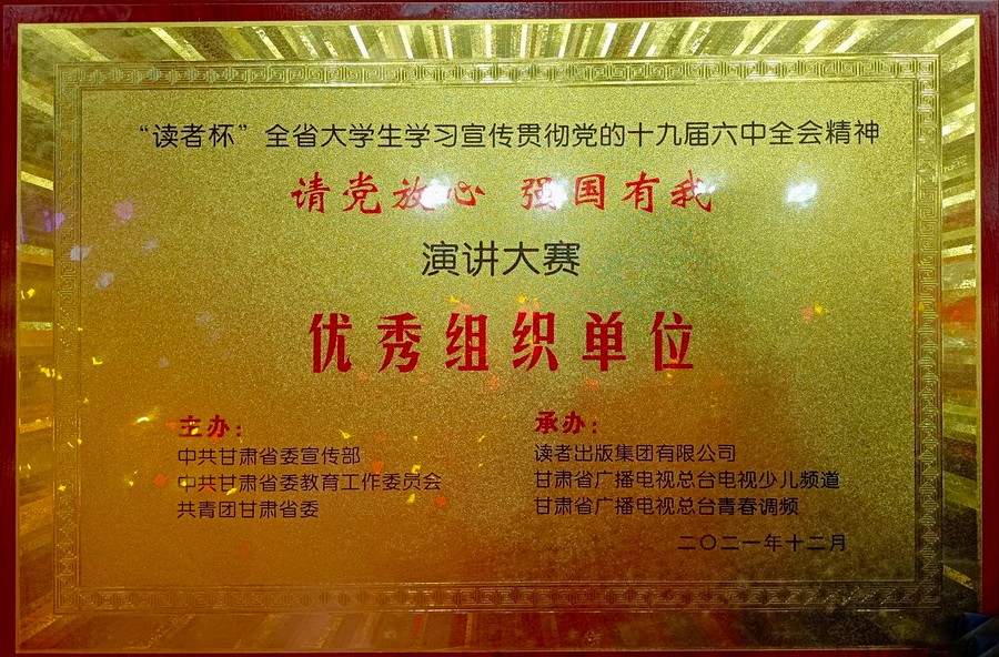 为了教育引导全省高校青年学生学习宣传贯彻党的十九届六中全会精神,营造浓厚舆论氛围,开展广泛而生动的基层宣讲,由省委宣传部、省委教育工委、团省委主办,读者出版集团有限公司、甘肃省广播电视总台电视少儿频道、总台青春调频承办的“读者杯”全省大学生学习宣传贯彻党的十九届六中全会精神“请党放心 强国有我”演讲大赛决赛于12月28日至29日在甘肃省广播电视总台演播大厅进行,来自全省高校的50件作品进入了现场决赛。最终,由校团委选送、新莆京官网选手刘丹同学演讲的作品《以青春之我 耀信仰之光》获大赛二等奖,同时新莆京官网获大赛优秀组织奖。