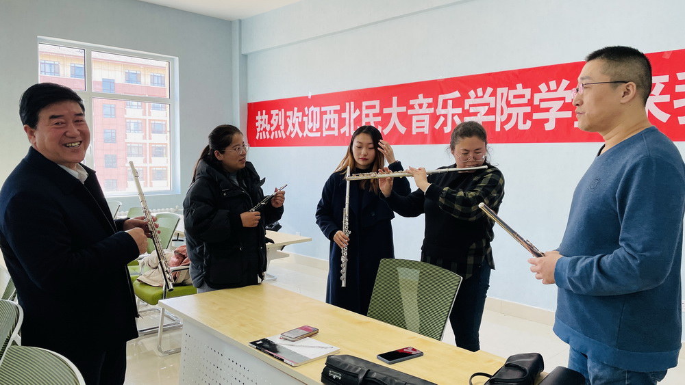 本次排练特邀请了西北民族大学音乐学院8位实习生来校指导。排练开始前,校党委书记姜德民作了简要发言,他代表学校对实习同学的到来表示热烈欢迎,对他们的专业知识和技能给予充分肯定,并向他们介绍了学校教职工管乐队的基本情况,并鼓励教职工管乐队的全体老师要珍惜机会,认真排练。随后,校团委书记衡冰对实习生及管乐队全体成员提出了几点排练要求,期待他们能早日取得成绩,并向全校师生汇报演出。随后,在8位实习生的悉心指导下,教职工管乐队开始排练。