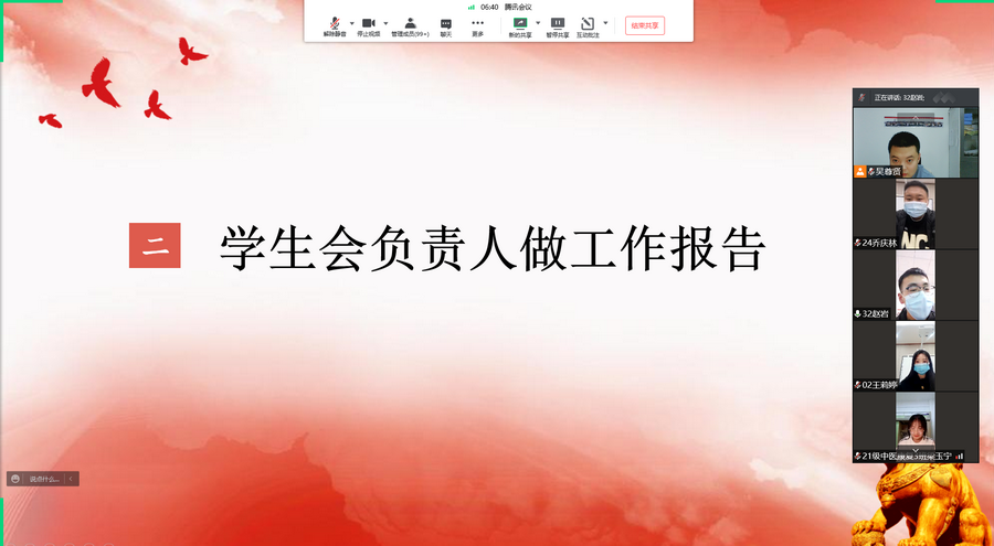 11月18日下午,中医药学院第二届学生代表大会以线上腾讯会议的方式召开,大会由中医药学院团委副书记吴尊贤主持。学院党总支书记杨频、副书记王彪,团学管理办公室工作人员及学生代表共160余人参加了大会。